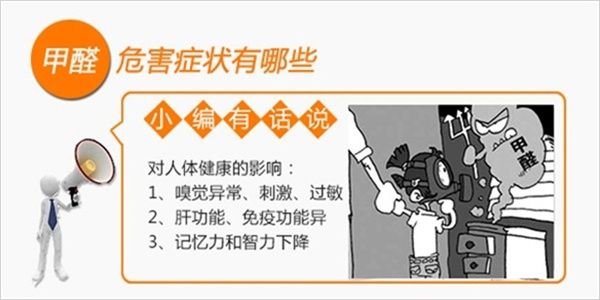 致病癥狀:長期接觸或吸入甲醛,會引起呼吸系統疾病、皮膚疾病、血液疾病等,嚴重者會致癌,導致鼻咽癌、白血病等。