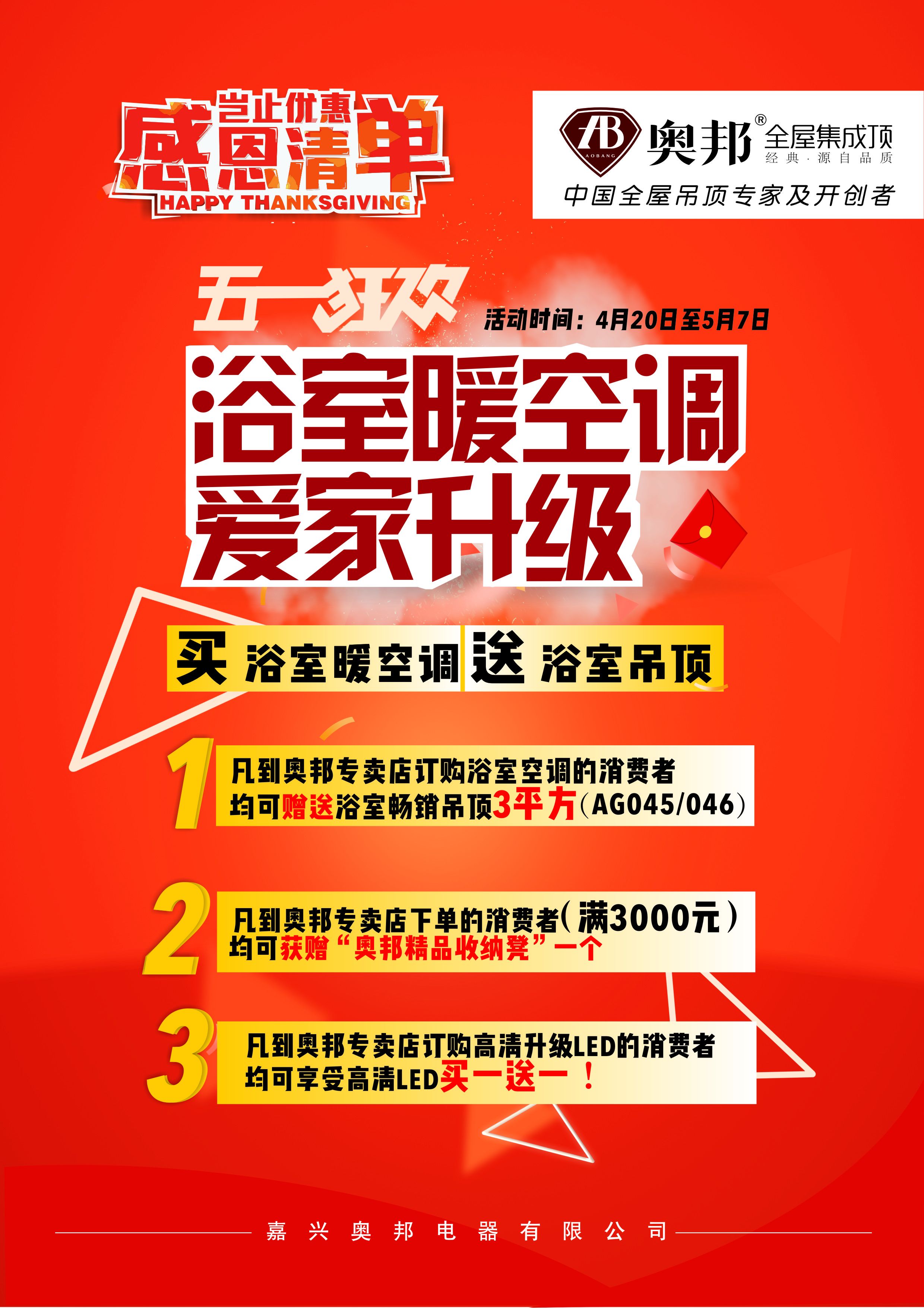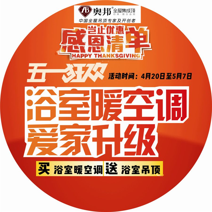 五月是勞動人民的節日,奧邦全屋集成頂從4月20日到5月7日推出“五一狂歡”活動。一、凡到奧邦專賣店訂購浴室空調的消費者均可贈送浴室暢銷吊頂3平方(AG045/046) 二、凡到奧邦專賣店下單的消費者(滿3000元)均可獲贈奧邦精品收納凳一個 三、凡到奧邦專賣店訂購高清升級LED的消費者均可享受高清LED買一送一! 如有不明請咨詢奧邦專賣店客服人員。奧邦全屋集成頂保留對此次活動的最終解釋權