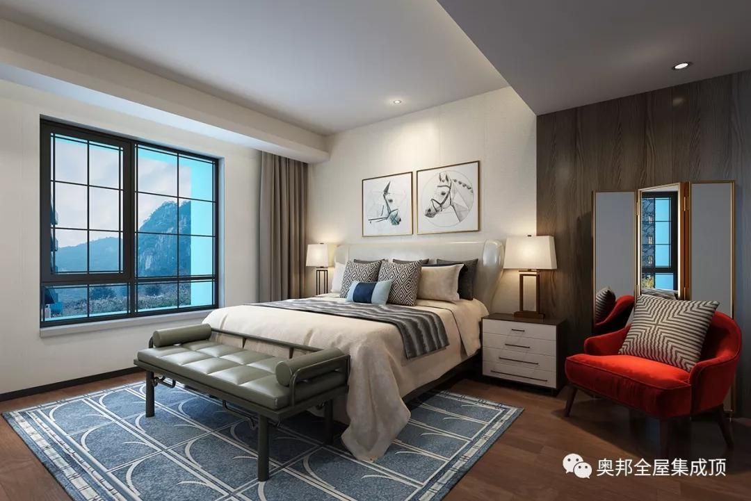 家最重要的地方是客房,不需要太亮堂,溫馨有情調(diào)是重點,吊頂不妨可以設計成高低錯落,顯得空間更寬闊;墻體也可以分隔成不同色調(diào),落地鏡和一張紅色小沙發(fā)來點綴,將空間完美利用。